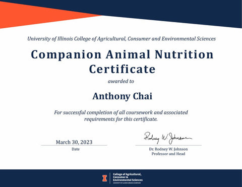 We take great pride in our experience and expertise in providing a complete and balanced diet. Our founder, who holds a Graduate Certificate in Companion Animal Nutrition from the University of Illinois, has been crafting custom recipes for pets with special dietary needs since 2014.